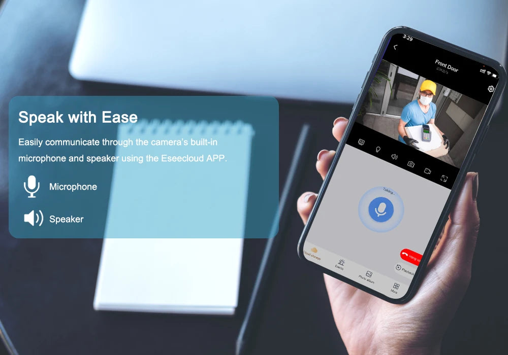 Built-in microphone and speaker, you’ll be able to listen and speak through the wireless camera, easily connect with family , talk to pets or even scare off the unexpected person no matter where you are.